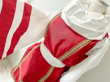 「シンプルな衣装なので、よりキャラに似せられるよう生地感とシルエットを大事にしました。小柄なキャラの再現として袖をあえて長めに、舞った時の袖を開くよう大きめに制作、マフラーも十分に幅と長さを取りました。剣の制作は、背中に背負った時の肩から見えるバランスを考慮し、長さを調節、キャラのように飛んだりラフに動き回れるよう鞘ごと作り込みました。時代背景上ピカピカと言うより使用感を出すため、剣にはウェザリングを加えました。