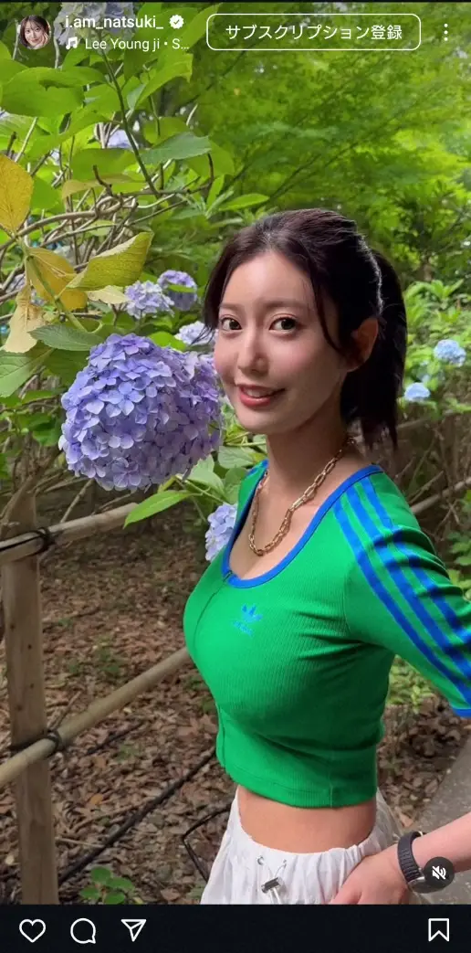 「紫陽花、みつけた 今年も半分が終わってしまったと思うと、なんだか寂しく感じます みんなにとって、どんな半年でしたか?」などとつづり、淡い紫色のアジサイをバックにしたグリーンのトップス姿のショットをアップした。