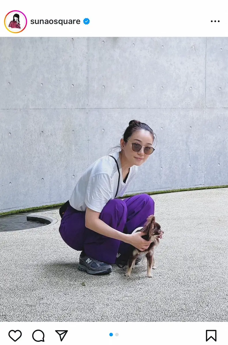 白のTシャツにボトムは紫のパンツ、サングラスを身に着けお団子ヘア姿で、愛犬と散歩するショットを公開した。