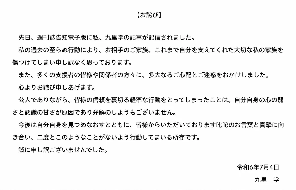 私の過去の至らぬ行動により、お相手のご家族、これまで自分を支えてくれた大切私の家族を傷つけてしまい申し訳なく思っております。