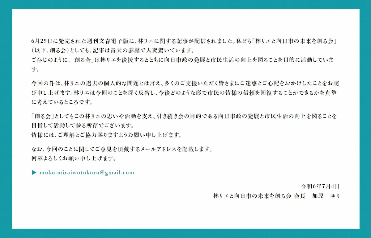加原氏は、林氏をめぐる報道を受け「6月29日に発売された週刊文春電子版に、林リエに関する記事が配信されました。私ども林リエと向日市の未来を創る会(以下、創る会)としても、記事は青天の霹靂で大変驚いています」と記した。