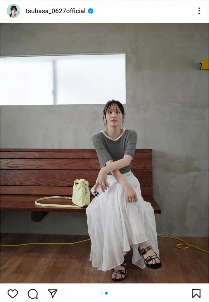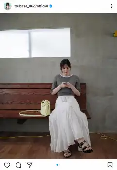 Tシャツに白いロングスカートを合わせたファッションを披露し、「後ろでキュッと結んで着てます」と、着こなしのアレンジを伝えた。