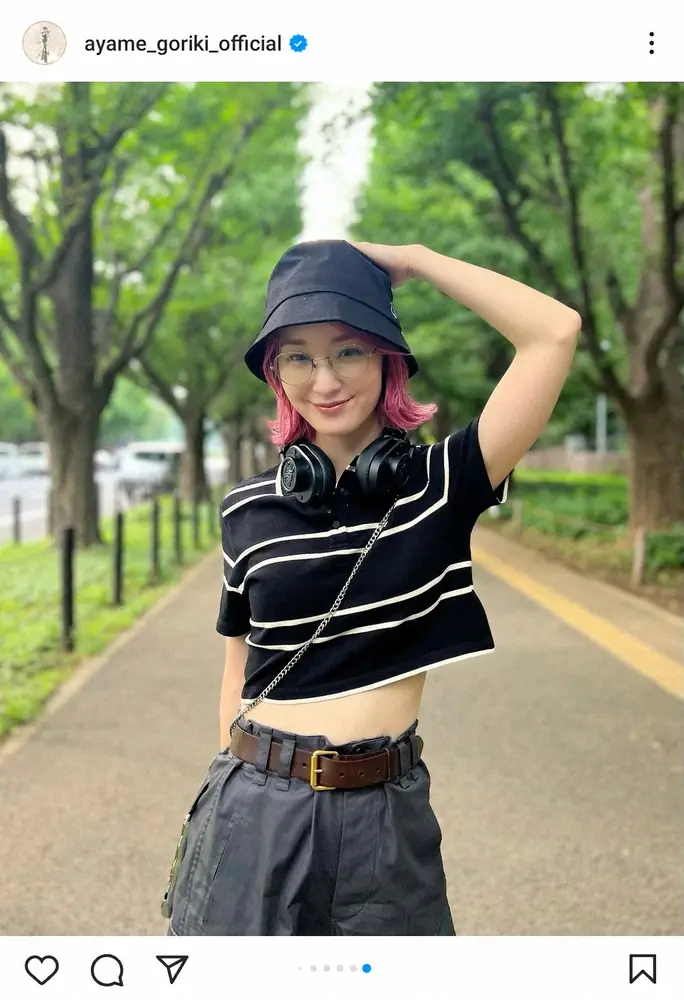 剛力は歩く人とヘッドホンの絵文字でコメント。ハッシュタグで「ashion」「ootd(=今日のコーデ)」「私服」と添え、ハットにメガネ、ヘッドホンなどを身につけ、黒でまとめたファッションを披露した。