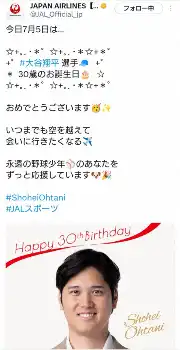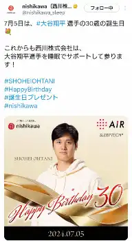2018年にサポート契約を結んだ日本航空は「おめでとうございます。いつまでも空を越えて会いに行きたくなる。永遠の野球少年のあなたをずっと応援しています」と祝福。寝具メーカーの西川も「7月5日は、大谷翔平選手の30歳の誕生日。これからも西川株式会社は、大谷翔平選手を睡眠でサポートして参ります!」と投稿した。