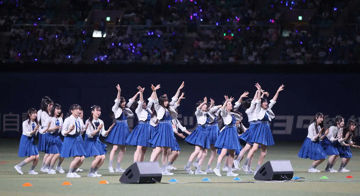 ライブではデビュー曲の「青空について考える」をメンバーで熱唱。「野球観戦」×「音楽」の進化型夏フェスをテーマした「ブルーサマーフェスティバル2024」を開催中で、青く染まった竜の本拠地を大いに沸かせた。