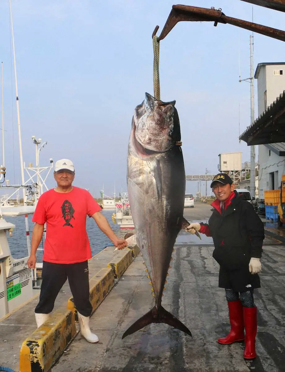 マグロの一本釣りに成功した福田こうへい(右)と「一番マグロの謳」の作詞を手がけた漁師の熊谷義宣さん
