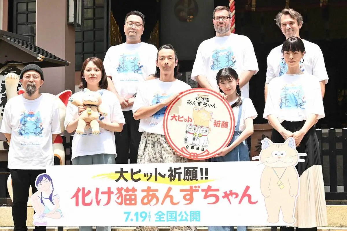 アニメ映画「化け猫あんずちゃん」ヒット祈願イベントに出席した(前列左から)山下敦弘監督、久野遥子監督、森山未來、五藤希愛、市川実和子、(後列同)近藤慶一氏、エマニュエル=アラン・レナール氏、ピエール・ボサロン氏(撮影・糸賀日向子)