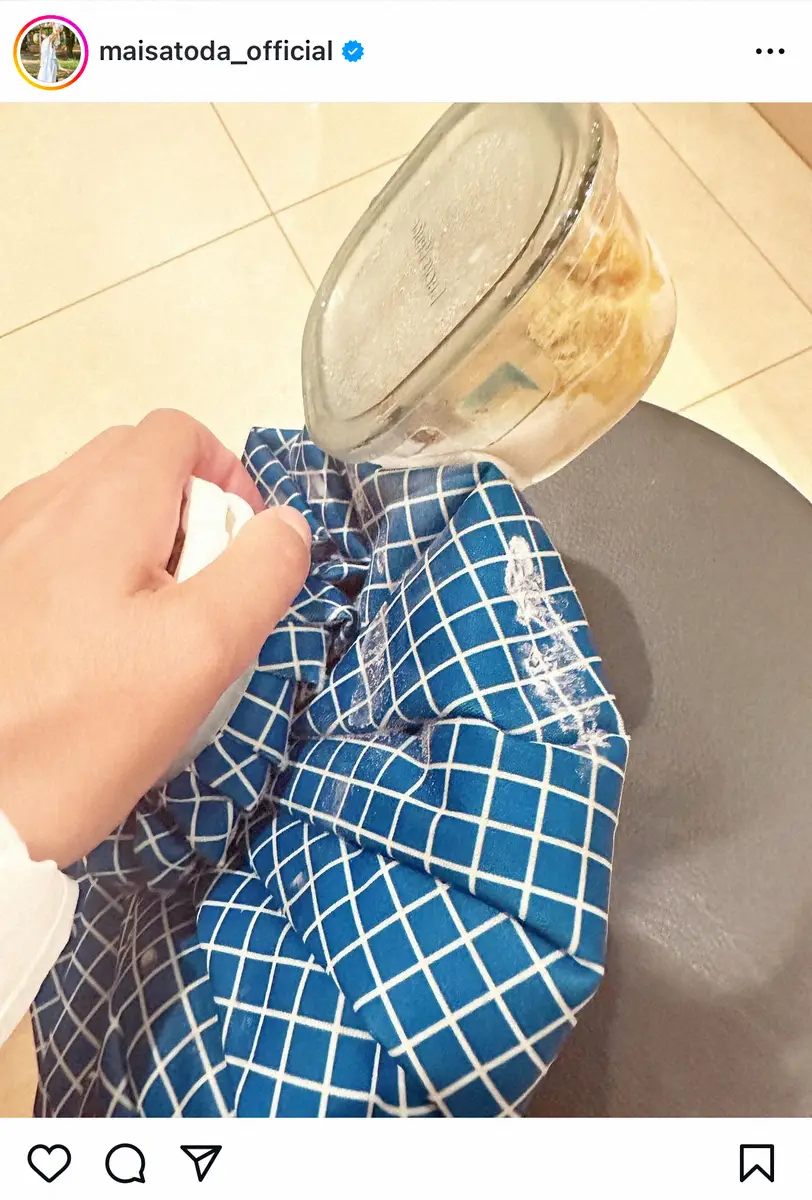 里田は、氷のうとお弁当箱がくっついた写真をアップ。「写真は、息子の少年野球の朝、凍らせた氷嚢を取り出したら、氷嚢の隣が冷凍してあったカレーだったみたいで、くっついていて、全然取れなくて慌てた日の写真」と説明した。