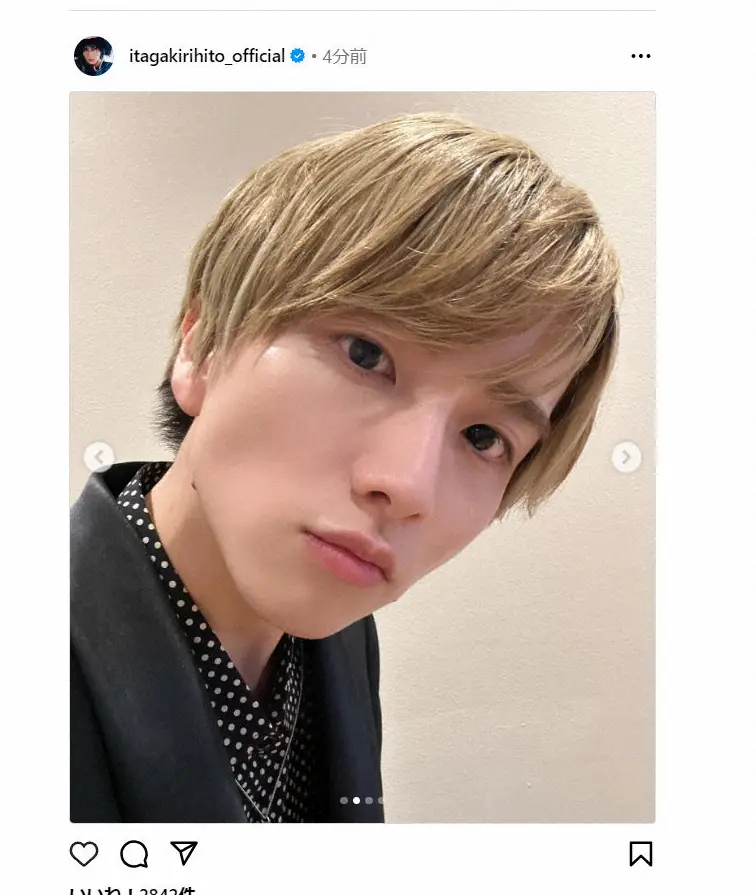 この投稿にフォロワーからは「どこの美少年かと思ったら板垣さんでした」「めっちゃ金髪似合ってるし、可愛い」「イケメンに拍車がかかって最高です」などのコメントが寄せられた。