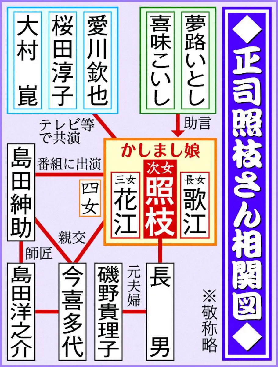 正司照枝さん Photo by スポニチ 正司照枝さん死去 91歳、急性心臓死「かしまし娘」次女 姉・歌江さん、… ギャラリーで見る この記事のフォト 2024年07月11日の画像一覧 もっと見る 2024年07月11日の画像をもっと見る