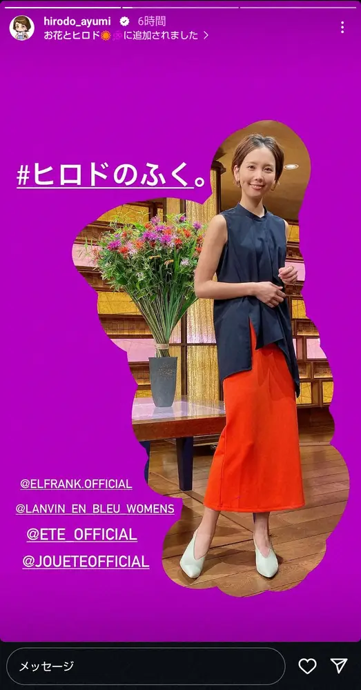 続く投稿では「ヒロドのふく」とのハッシュタグで、番組で着用している衣装を掲載。カジュアルな私服とのギャップを見せた。