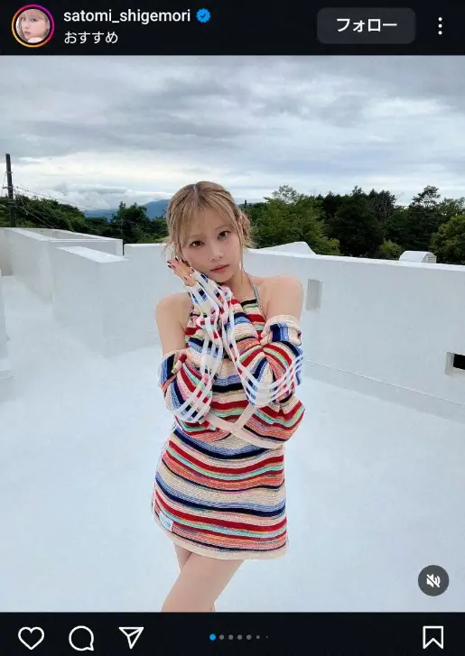 タレントの重盛さと美(35)が12日までに自身のインスタグラムを更新。超ミニ丈の虹色ワンピース姿を披露した。