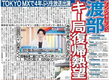 週刊誌記者 局に出入りする時には、車両通路には幕が張られていた。出て行く時は、後部座席の右側に座った渡部を女性マネジャーが覆いかぶさるようにして、写真を撮らせないようにするなど徹底ガードしていた。そこまでするかと驚いたよ。