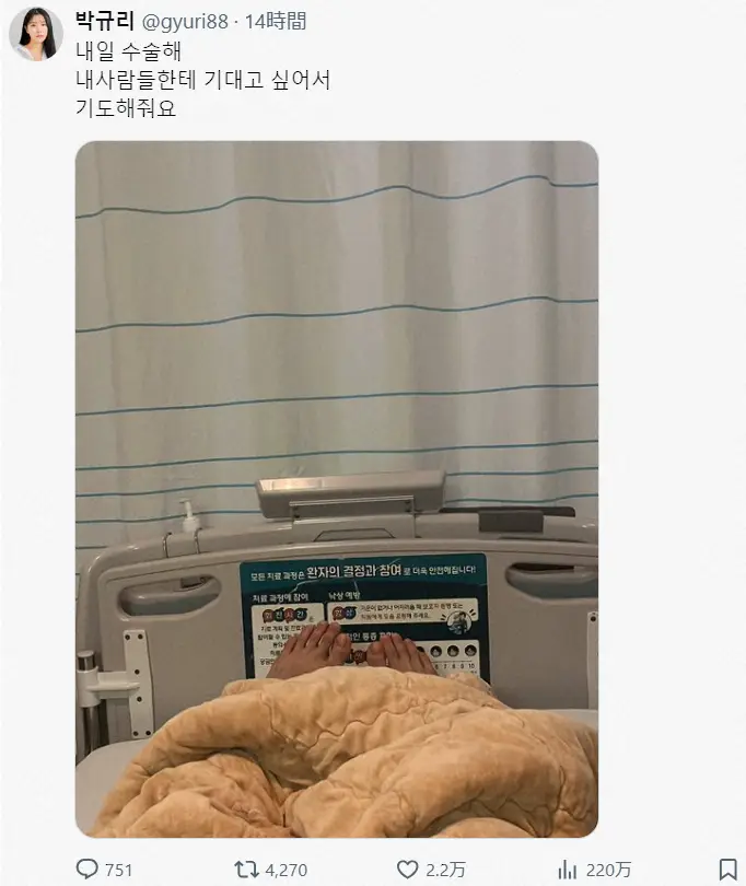 ギュリは14日、「明日手術する 私の大切な人に頼りたいから 祈っててください」とつづり、入院している病院のベッドからの写真を投稿。15日に手術することを報告した。