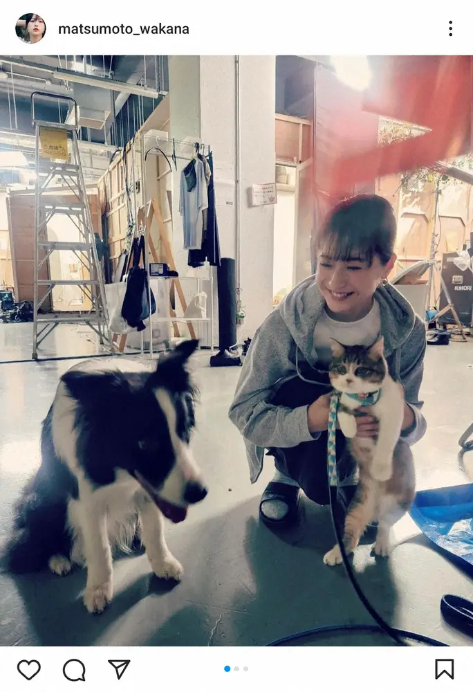 そして「さて、写真は自由気ままな西園寺さんとリキとうみちゃん」と、松本が演じる「西園寺」の飼い犬「リキ」役のダンと、猫のうみとの写真を掲載。「うみちゃんはリキ役のダンくんのお友達」と紹介した。