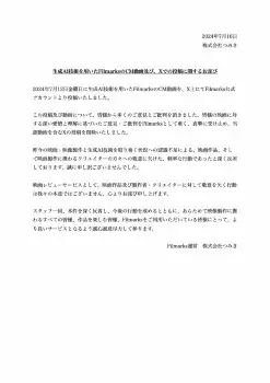 続けて「生成AI技術を用いたFilmarksのCM動画及び、Xでの投稿に関するお詫び」を発表。「この投稿及び動画について、皆様から多くのご意見とご批判を頂きました。皆様の映画に対する深い愛情と理解に基づいたご意見・ご批判をFilmarksとして重く、真摯に受け止め、当該動画を含むXの投稿を削除いたしました」と説明した。