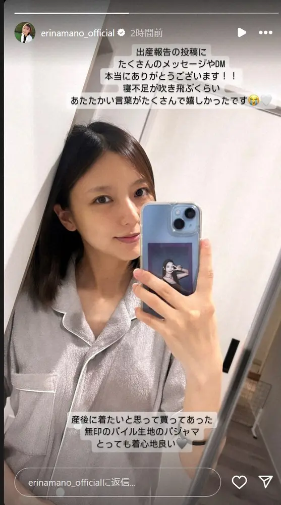 この日はストーリーで「出産報告の投稿に たくさんのメッセージやDM本当にありがとうございます!!寝不足が吹き飛ぶくらいあたたかい言葉がたくさんで嬉しかったです」と感謝した。