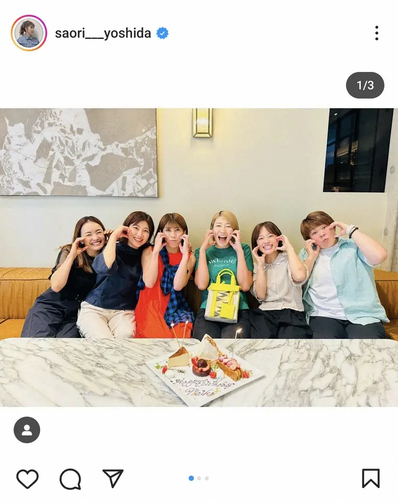 女子レスリング五輪3連覇の吉田沙保里さん(41)が16日、自身のインスタグラムを更新。元アスリートらと元バレーボール日本代表の狩野舞子さん(36)の誕生日会をしたことを明かし、集合ショットを披露した。