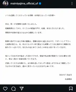 矢島は「先日、第一子を無事に出産いたしました」とファンに向けて報告。「妊娠発表をしてから、たくさんの祝福の声や、応援、本当に力になりました。事務所や家族の協力にも心から感謝しています」と周囲のサポートに感謝をつづった。
