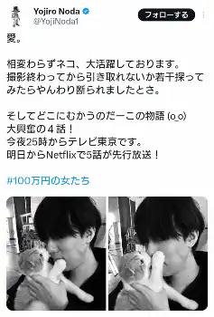 また、17年に主演したテレビ東京系ドラマ「100万円の女たち」では共演者から「野田さんはよく猫と話してますね」と言われたほどで、自身のXでも猫と戯れる写真とともに「撮影終わってから引き取れないか若干探ってみたらやんわり断られましたとさ」とつづっていた。