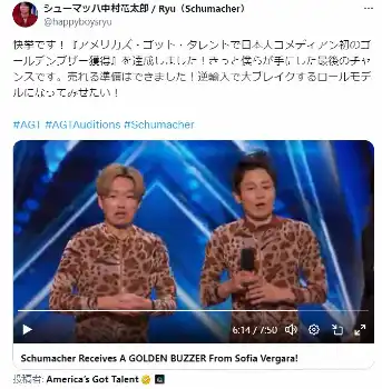 お笑いコンビ「シューマッハ」中村竜太郎(37)が18日、自身のX(旧ツイッター)を更新し、米国のオーディション番組「アメリカズ・ゴット・タレント(AGT)」で日本人コメディアン初の「ゴールデンブザー」獲得が判明してから一夜明けての変化を語った。