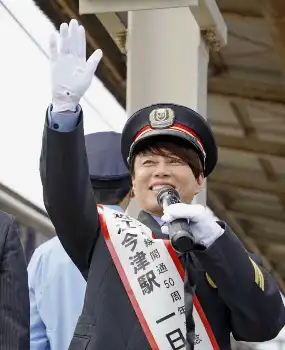 西川貴教 JR近江今津駅で一日駅長 JR湖西線50周年記念列車に発車合図