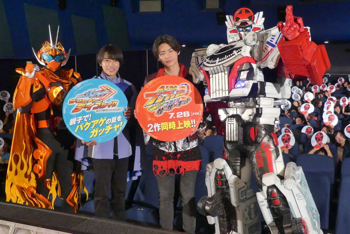 映画の先行上映会に出席した(左から)仮面ライダーガッチャードデイブレイク、本島純政、井内悠陽、ブンドリオ・ブンデラス