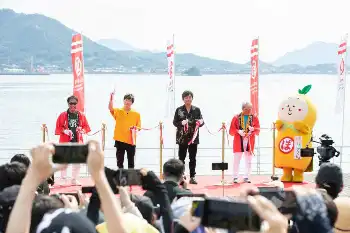 セレモニーにサプライズで登場した2人。島全体を使った催しに岡野昭仁は「25周年のこの節目で、お世話になってきた島の方に恩返しがしたかった」とニッコリ。新藤晴一は「夏の思い出の1日にしてもらえたら」と思いを語り、尾道市長の平谷祐宏氏らと並んでテープカットを披露した。