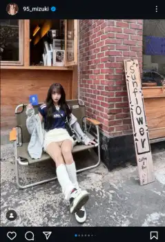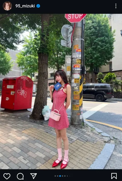 韓国を訪れていたことを明かし、紺色のポロシャツに白のミニスカート、ハイソックス姿や、赤と白のチェックのミニ丈のワンピースにピンクのソックス姿など、ミニスカートをまとった複数の写真をアップした。