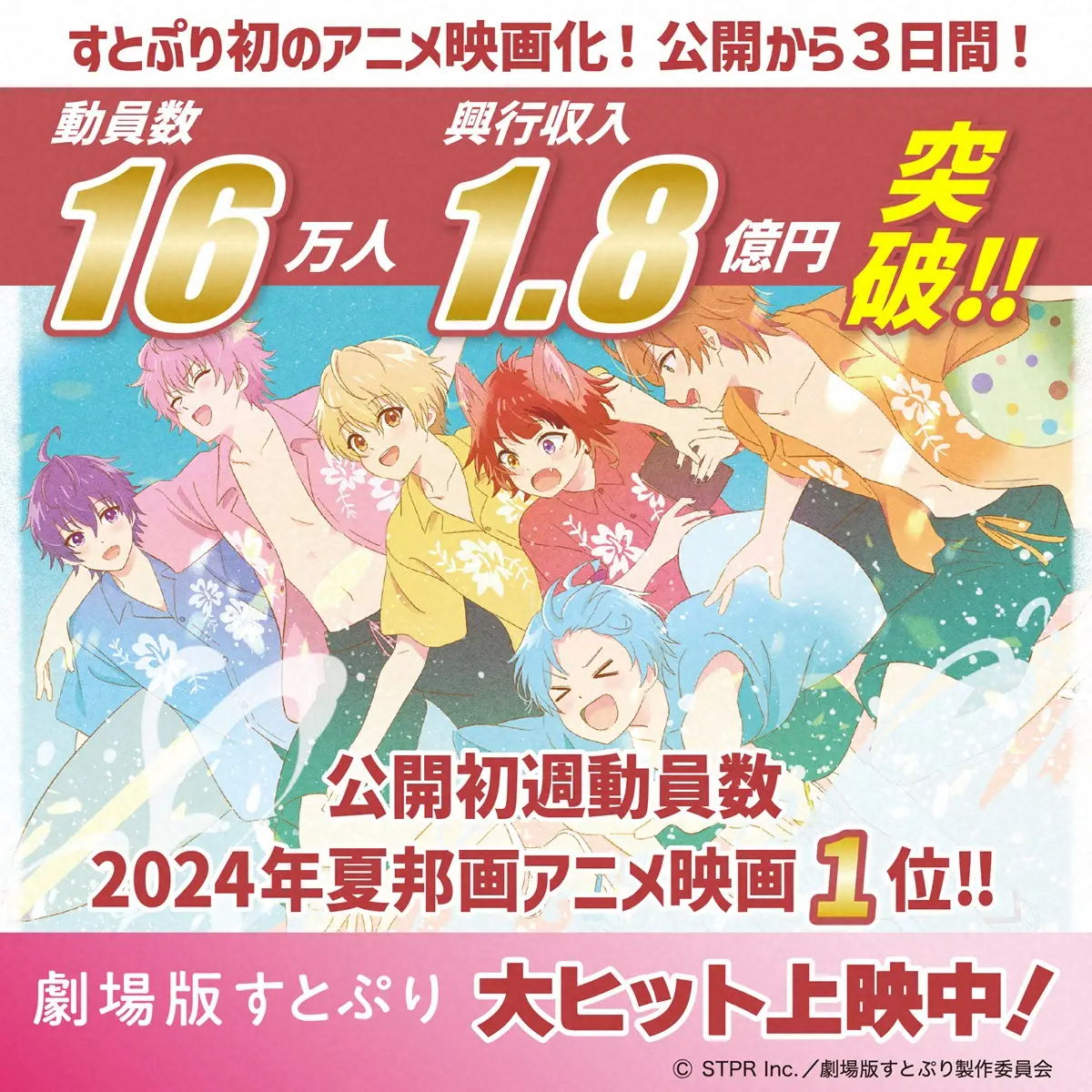 2.5次元歌い手アイドルグループ「すとぷり」の初主演アニメ映画「劇場版すとぷり はじまりの物語~Strawberry School Festival!!!~」が、公開初週3日間(19~21日)で観客動員約16万人、興行収入約1億8000万円と好スタートを切った。全国300館以上で公開して、2024年夏の邦画アニメ映画1位の成績となった。