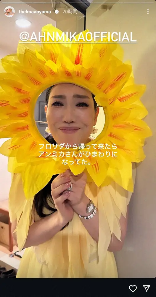 青山も自身のインスタグラムのストーリーズで「フロリダから帰って来たらアンミカさんがひまわりになってた」と、アンミカの"ひまわり姿"を投稿。「待ってたでぇ ひまわり今日咲いてないから私がひまわりになってみた!」というアンミカの言葉を引用し、「フワちゃんと2人で爆笑」「未だに水素水推してくる」とつづっていた。