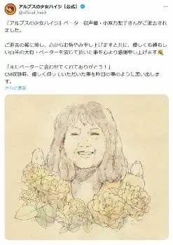 同作の公式SNSでは「『アルプスの少女ハイジ』ペーター役声優・小原乃梨子さんがご逝去されました」と書き出すと、「ご逝去の報に接し、心からお悔やみ申し上げますと共に、優しくも頼もしい山羊の大将・ペーターを演じて頂いた事を心より感謝申し上げます」と追悼した。