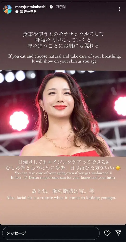 そして「日焼けしてもエイジングケアってできる」と断言。「むしろ骨と心のために多少、日は浴びた方がいい」と勧め、「あとね、顔の脂肪は宝。笑」と強調していた。