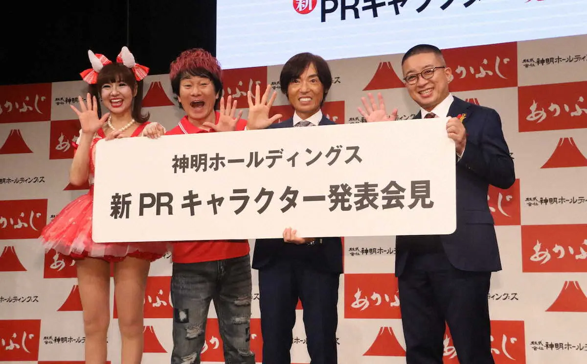 <「神明ホールディングス」の新PRキャラクター発表会見>会見に出席した(左から)かつみ、さゆり、藤尾益雄社長、松尾駿