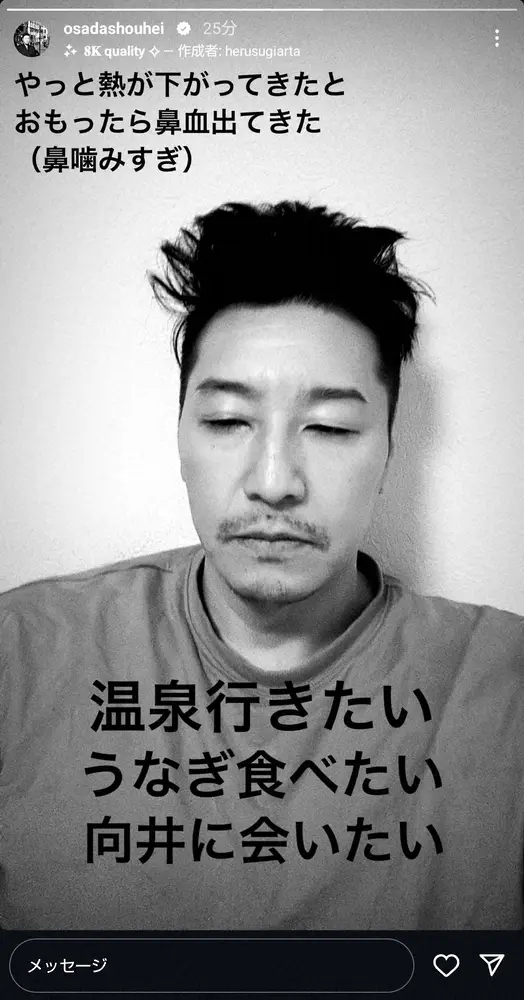 そして、この日ストーリーズを更新し「やっと熱が下がってきたとおもったら鼻血出て来た」と報告。「鼻噛みすぎ」と、心当たりを明かした上で、力無く目を伏せた写真を公開。「温泉行きたい うなぎ食べたい 向井に会いたい」とつづった。