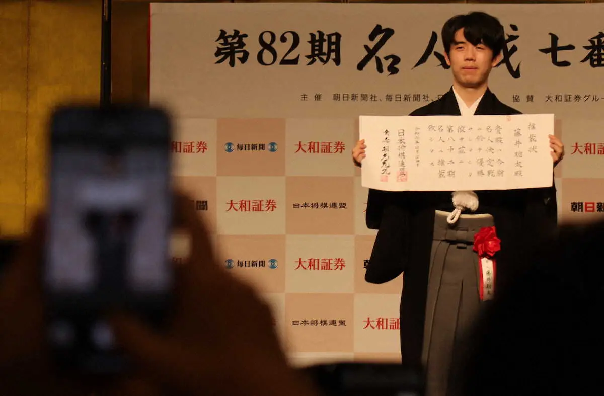 将棋の第82期名人就位式が24日、東京都文京区のホテル椿山荘東京で行われ、名人推戴状、賞金目録などが贈られた藤井聡太名人(22)は初の防衛に「将棋の難しさと向き合うことができたのは大きな財産。その経験を生かし、今後も実力を高めていけるよう精進していきたい」とあいさつした。
