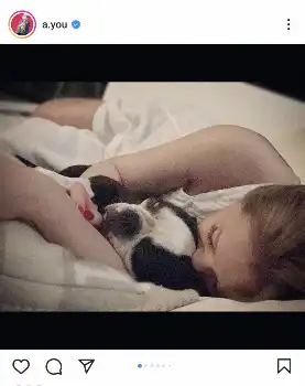 浜崎はパピコを抱いて横になる自身のショットや、パピコの愛らしいショット、パピコと既に他界している同じくボストン・テリアの愛犬・ピノとの思い出のショットなどをアップ。