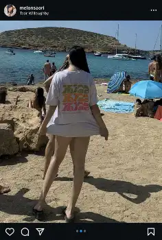 スペイン・イビザ島に訪れているSAORIは「綺麗な海。お気に入りのibizaのTシャツを着たよ!」とビーチでおしりが見えそうなTシャツのバックショットを投稿した。