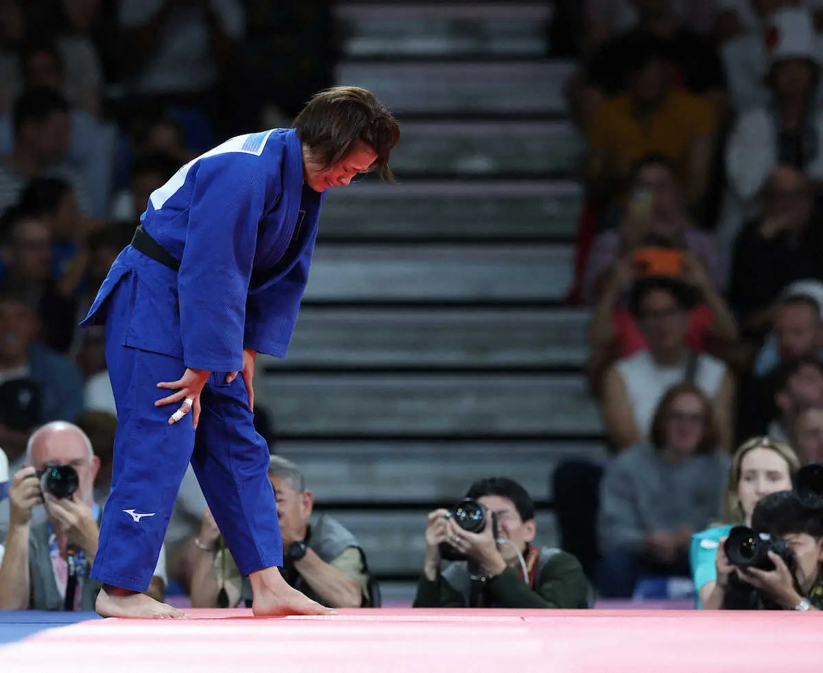 <パリ五輪 柔道>女子52キロ、2回戦で敗れ涙を流しながら畳に一礼する阿部詩(撮影・平嶋 理子)