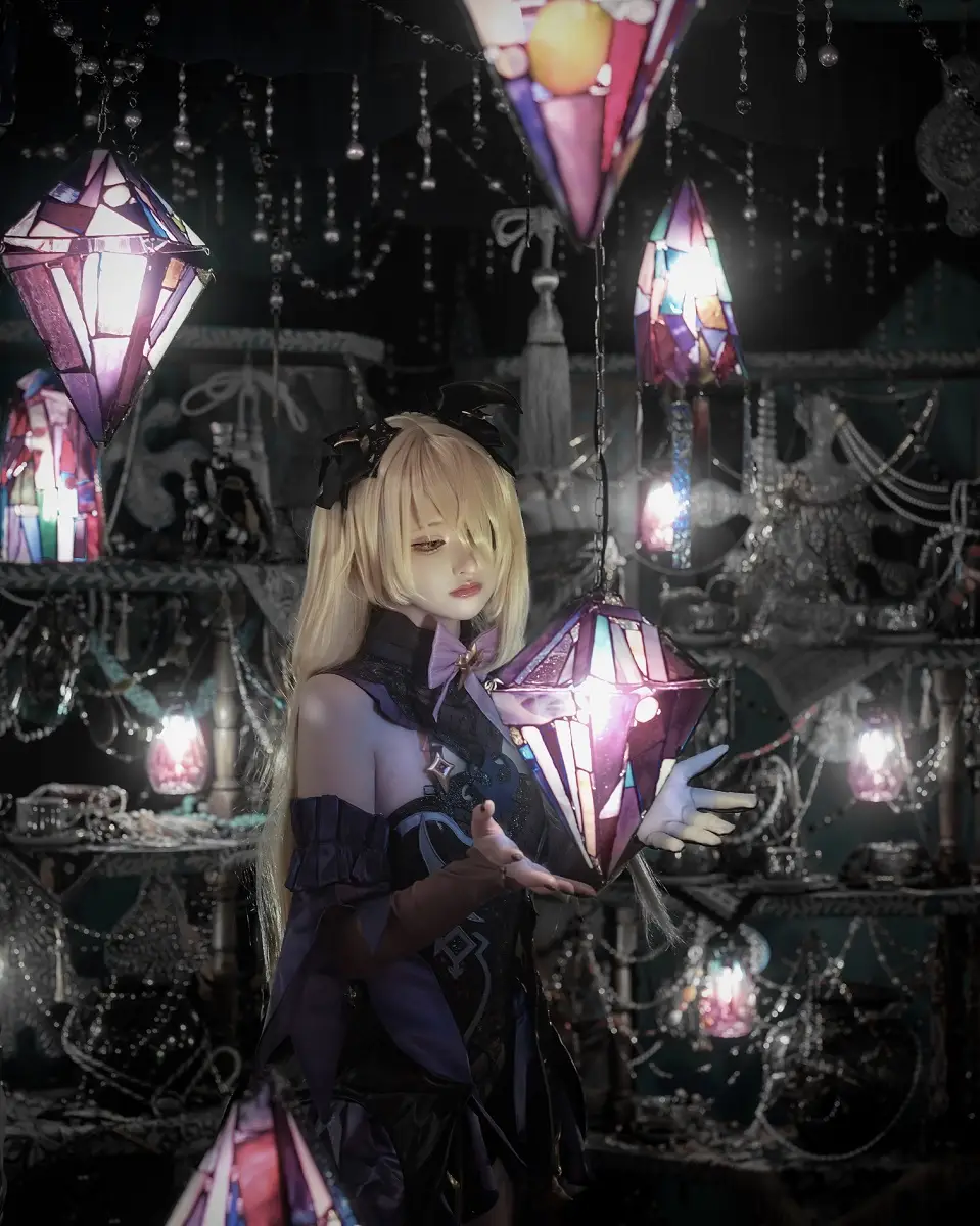 薄暗い室内。宝石のようなランプの微かな光によって、フィッシュルを演じるしおんさんの顔が照らされている。金髪のウィッグは丁寧にセットされ、自然な毛流れを再現。ダークなアイメイクと明るい眉毛でフィッシュルのあどけなさを巧みに表現した。柔らかな光によってキラリと光る爪先もポイントだ。