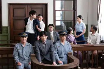 初公判。傍聴席で声を上げる被告人の弟・金広洙(成田瑛基)を、小野が鎮めた。