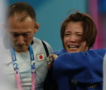 阿部は畳を下りるとその場に崩れ落ち、コーチの胸にしがみつき号泣。中継では大声で泣きじゃくる声が響き、中村アナもしばらく無言に。