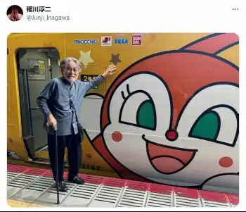 稲川は、国民的アニメ「アンパンマン」のキャラクター・ドキンちゃんが描かれた車両に左手を添え、杖をつきながらこちらに笑顔を見せる写真を投稿した。