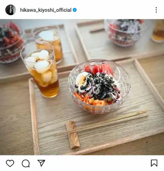 氷川は「今日のランチはビビン麺」とコメント。「ヤンニョムこさえて極細お蕎麦で」と日本と韓国の国旗の絵文字を添え、涼しげな食卓の写真を公開した。