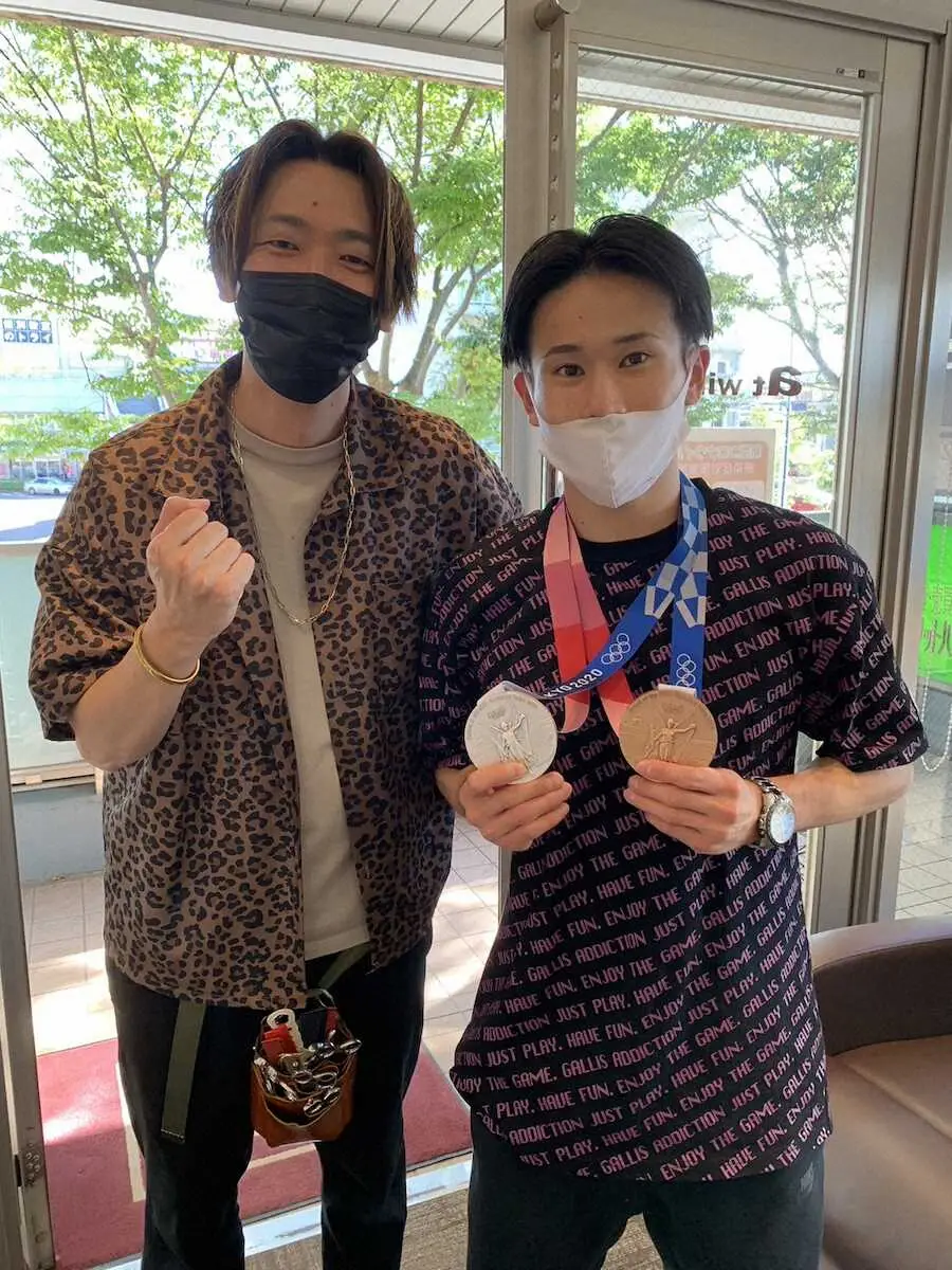 東京五輪のメダルを手にする萱和磨(右)と担当美容師の折笠善一さん