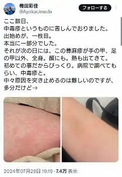 梅田は赤い湿疹が広がっている写真を投稿し「ここ数日、中毒疹というものに苦しんでおりました。出始めが、一枚目。本当に一部分でした。それが次の日には、この蕁麻疹が手の甲、足の甲以外、全身。顔にも。熱も出てきて。初めての事だからびっくり。病院で調べてもらい、中毒疹と」と報告。