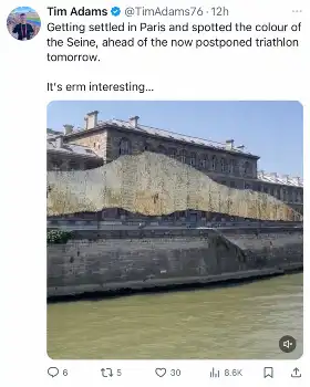 これを受け、アダムス記者は自身のXで「パリにきて、明日延期されたトライアスロンの前にセーヌ川の色を目にしました」と報告。「えっと、面白いですね...」という言葉とともに投稿された動画では、濁った色のセーヌ川が映し出されていた。