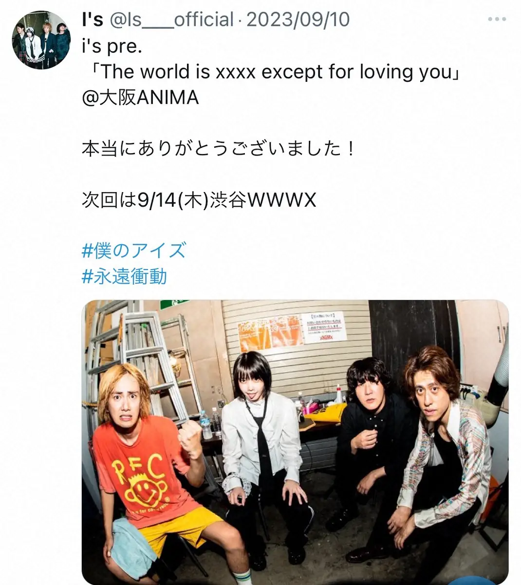 I'sの公式インスタグラム(@is_official0831)から あのちゃん所属のロックバンド「I's」が年内で解散発表 「メンバーはそれ… ギャラリーで見る この記事のフォト 2024年08月01日の画像一覧 もっと見る 2024年08月01日の画像をもっと見る