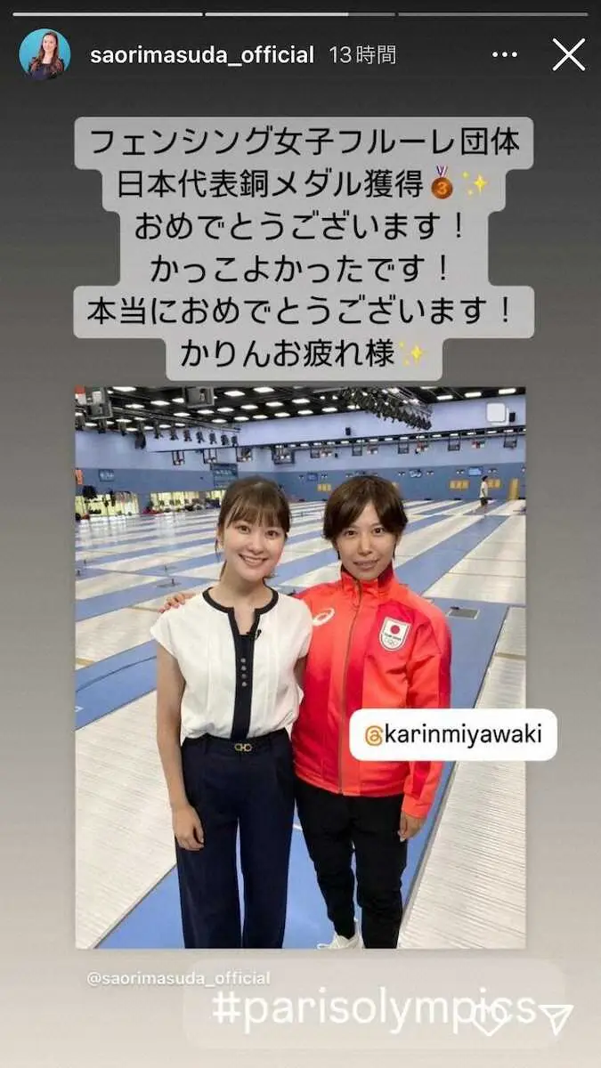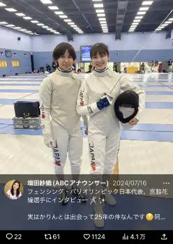 フェンシング女子フルーレ団体で銅メダルを獲得した宮脇花輪(右)を祝福した増田紗織アナ(増田の公式SNSから) ABC増田アナ 五輪フェンシング女子フルーレ団体メンバー宮脇と小学校から… ギャラリーで見る この記事のフォト 2024年08月03日の画像一覧 もっと見る 2024年08月03日の画像をもっと見る