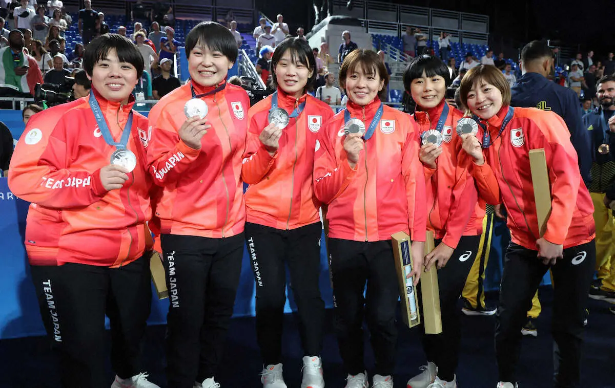 <パリ五輪 柔道>混合団体戦、銀メダルを獲得した(左から)素根輝、 高山莉加、新添左季、高市未来、舟久保遥香、角田夏実(撮影・平嶋 理子)
